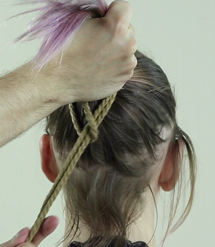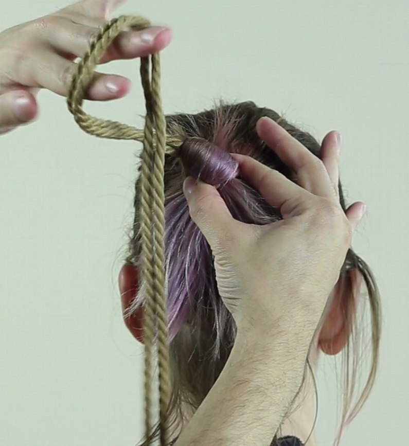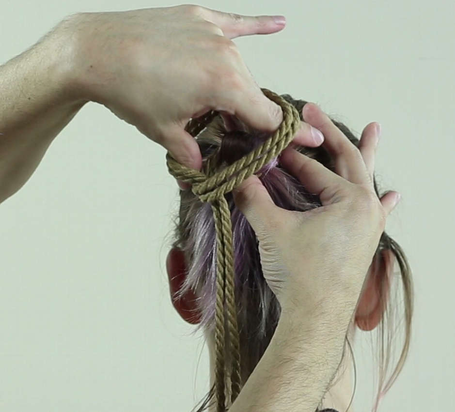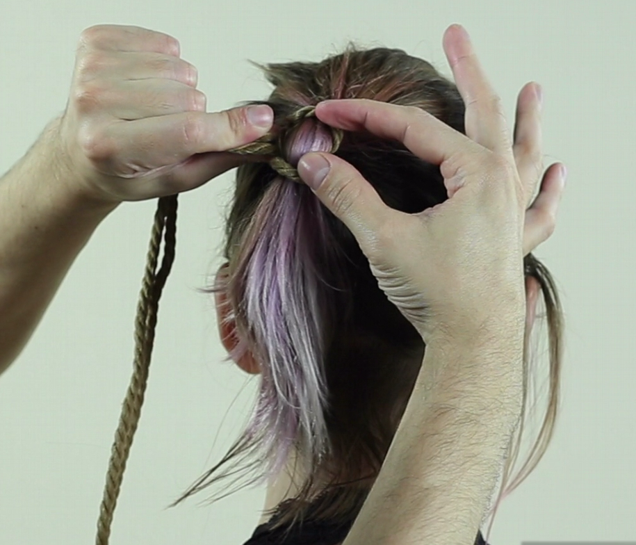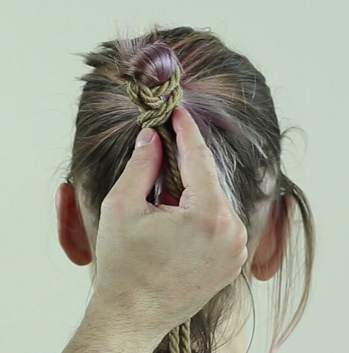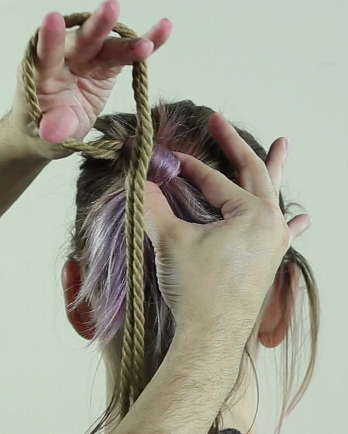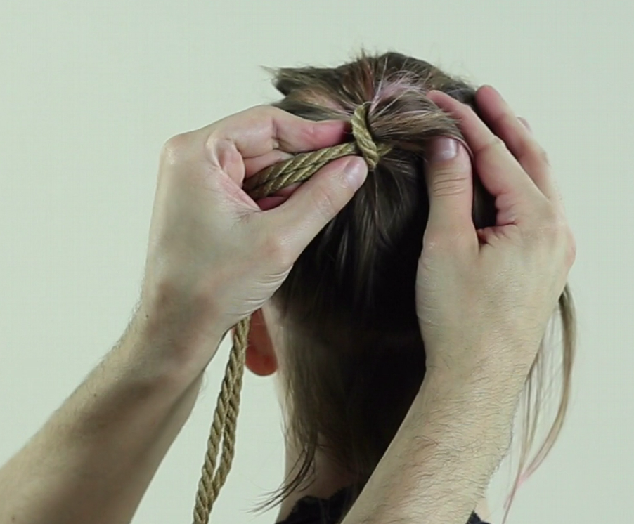 Repasser ainsi la corde autour des cheveux, elle doit passer SOUS votre premier passage et resserrer le lien.