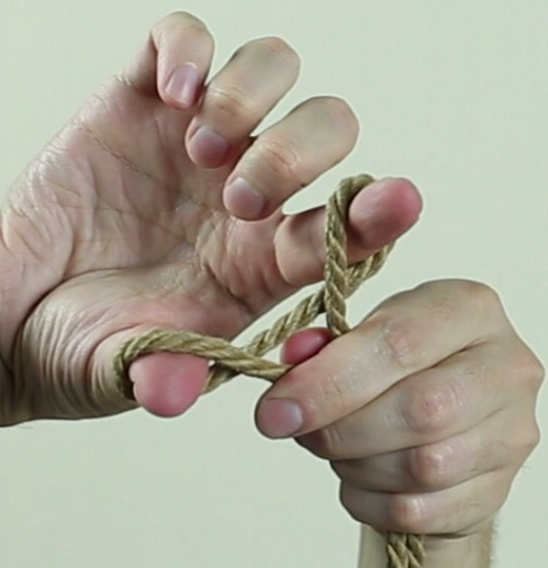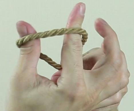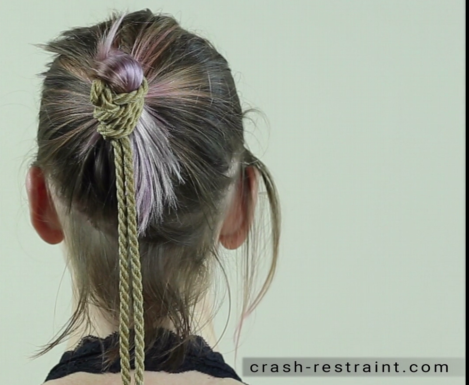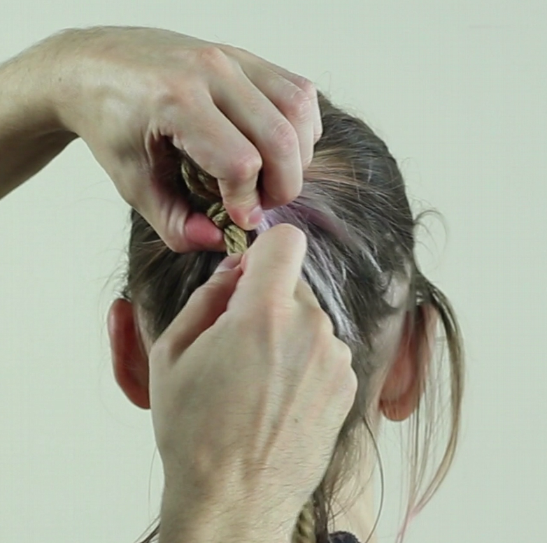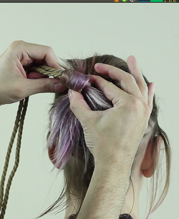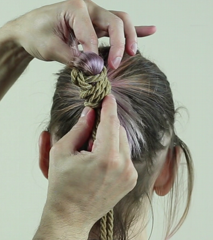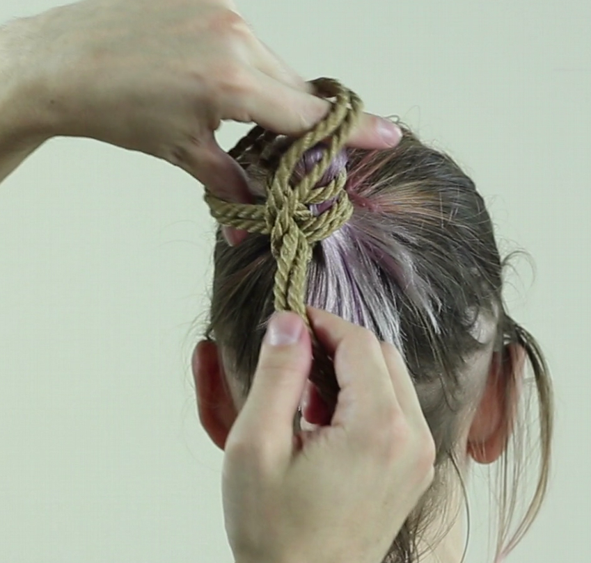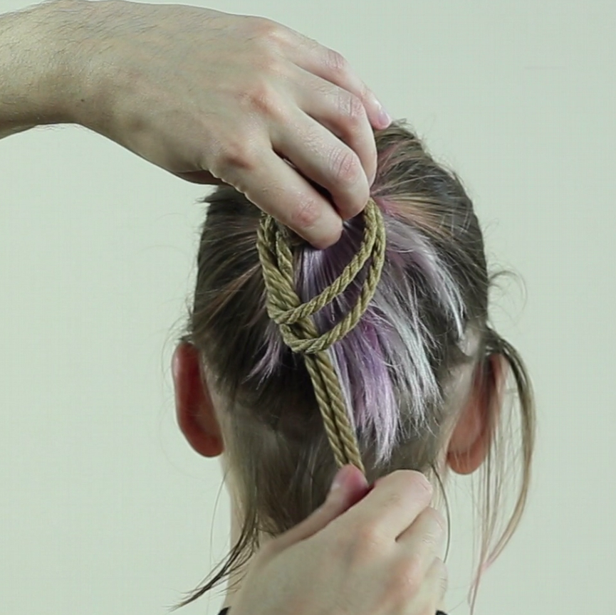 Repasser ainsi la corde autour des cheveux, elle doit passer SOUS votre premier passage et resserrer le lien.