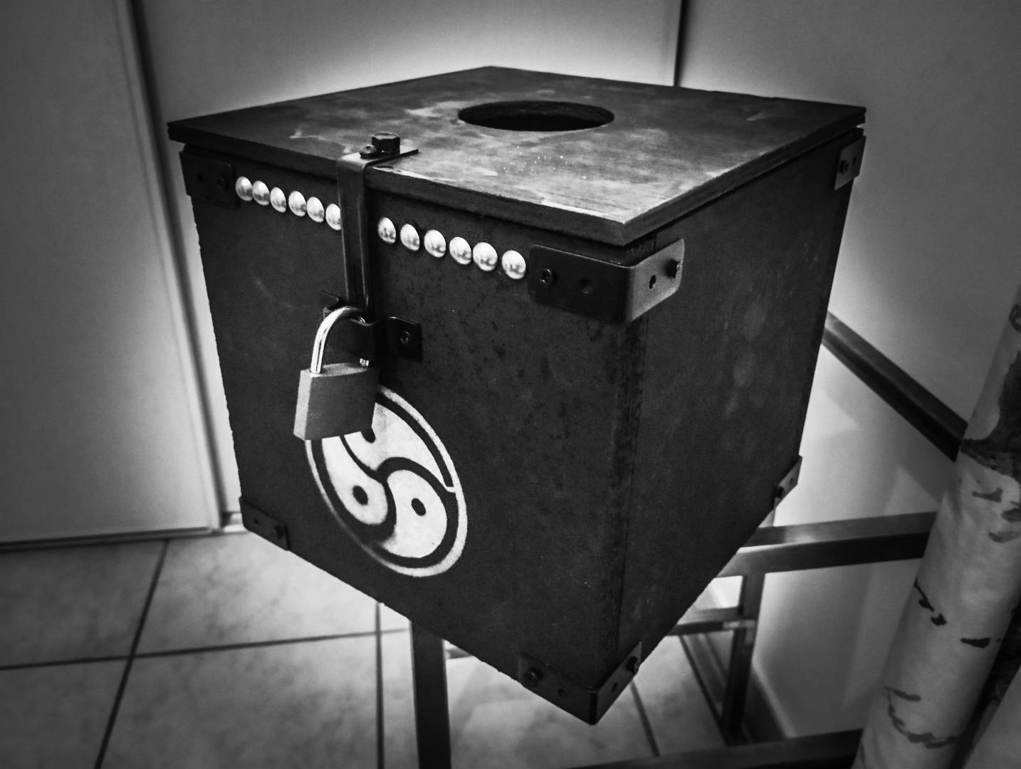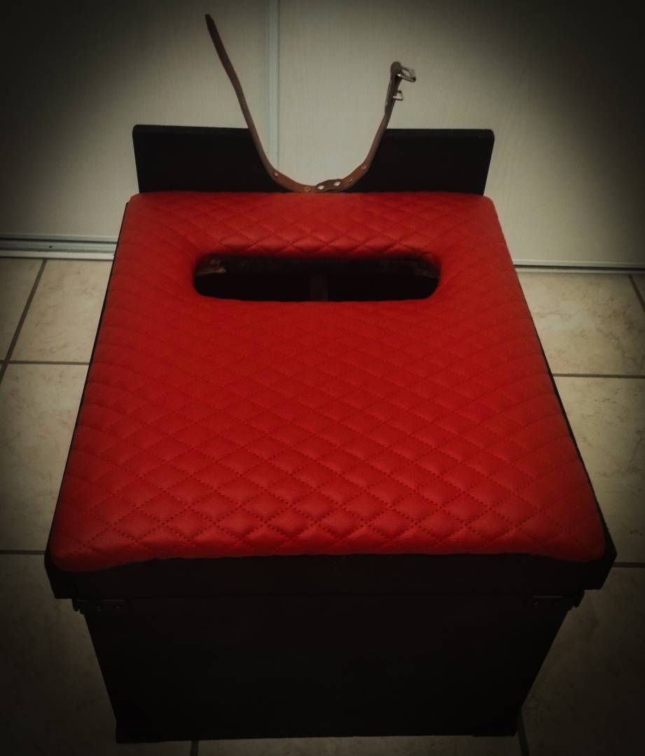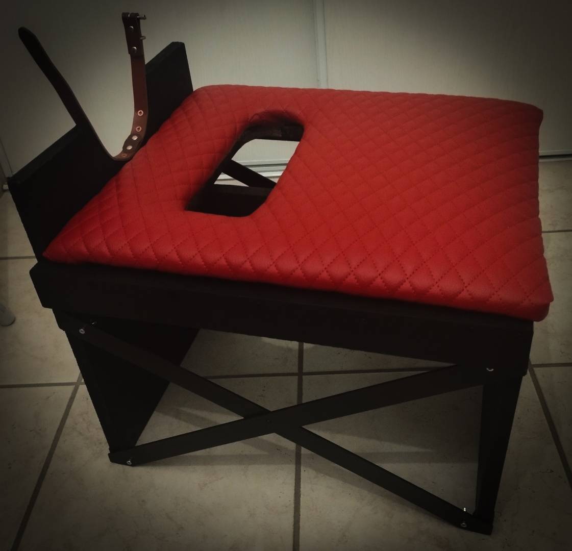 Une fois le meuble rendu plus solide, perçage de trous pour permettre aux seins de ressortir par en-dessous, parce que les pinces à tétons c'est la vie, et ajout d'un revêtement en simili cuir sur le plateau avec rembourrage en ouate de cellulose pour plus de confort et quelques clous de tapissier pour la déco. Puis installation des sangles de fixation pour le cou et les cuisses et de points d'ancrages pour les menottes.