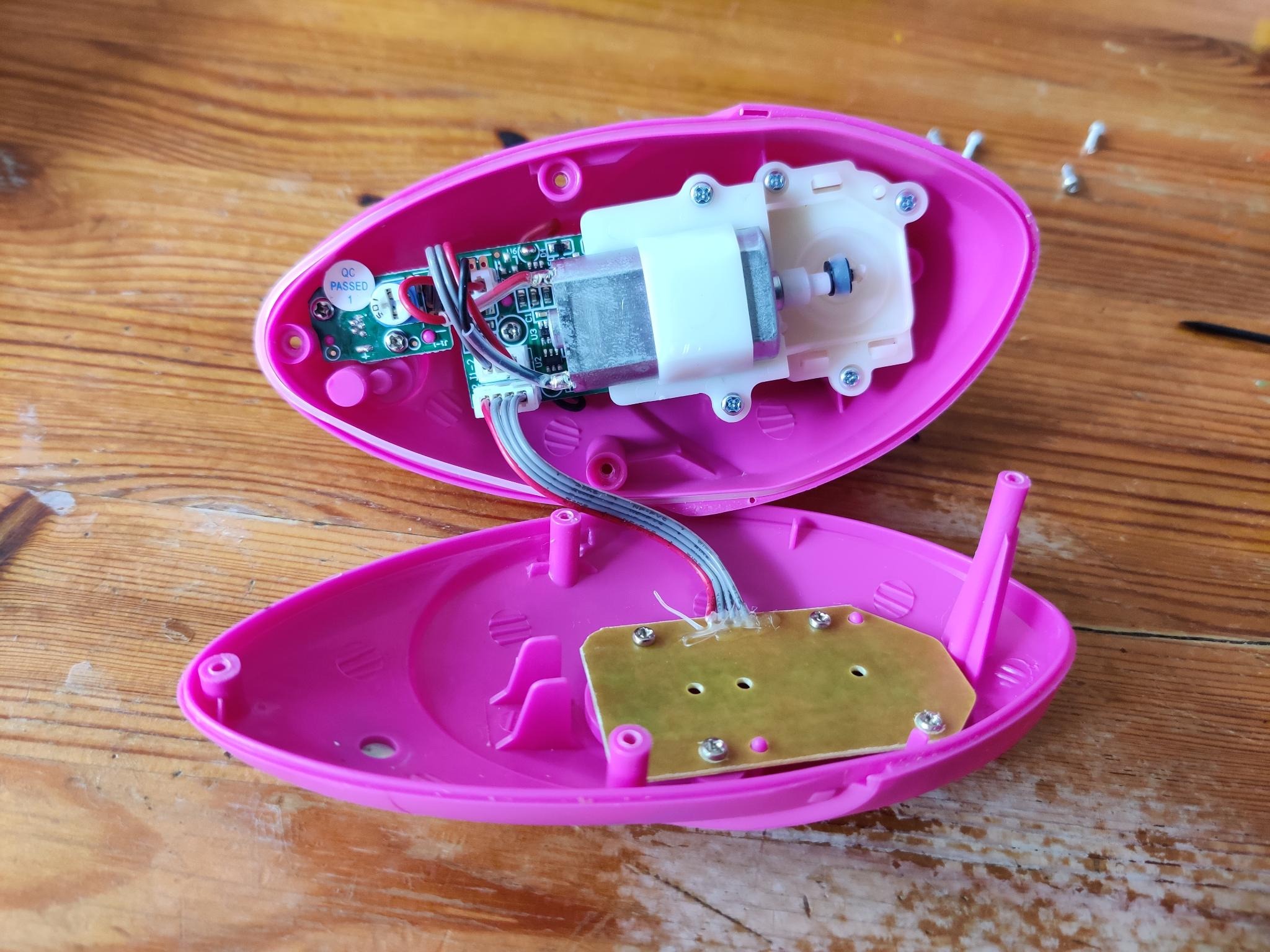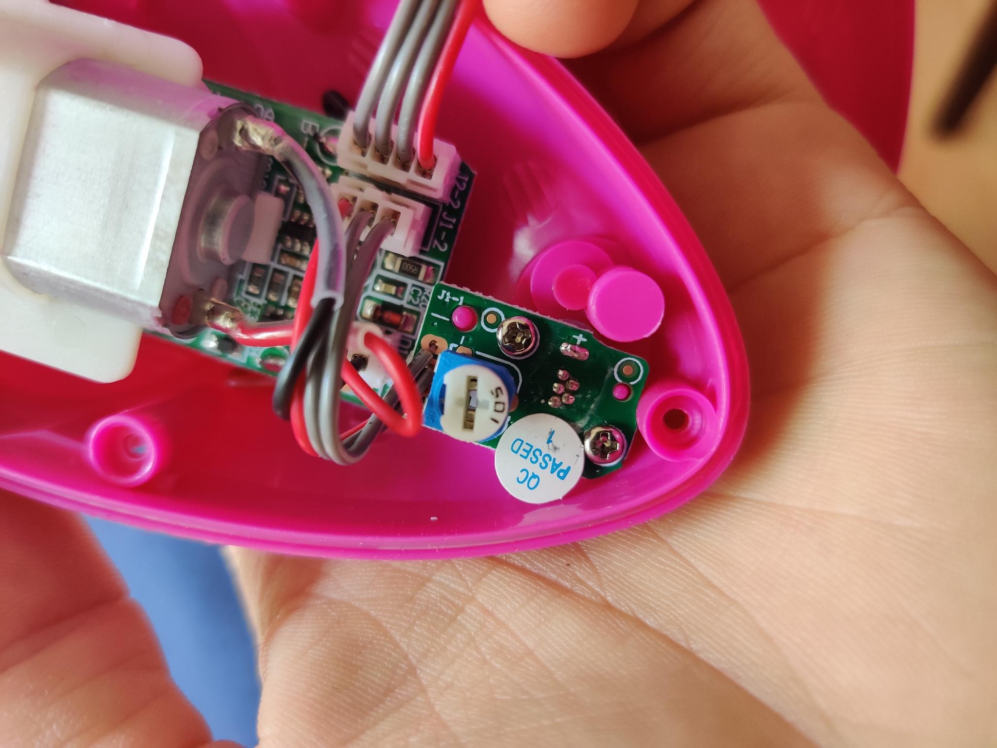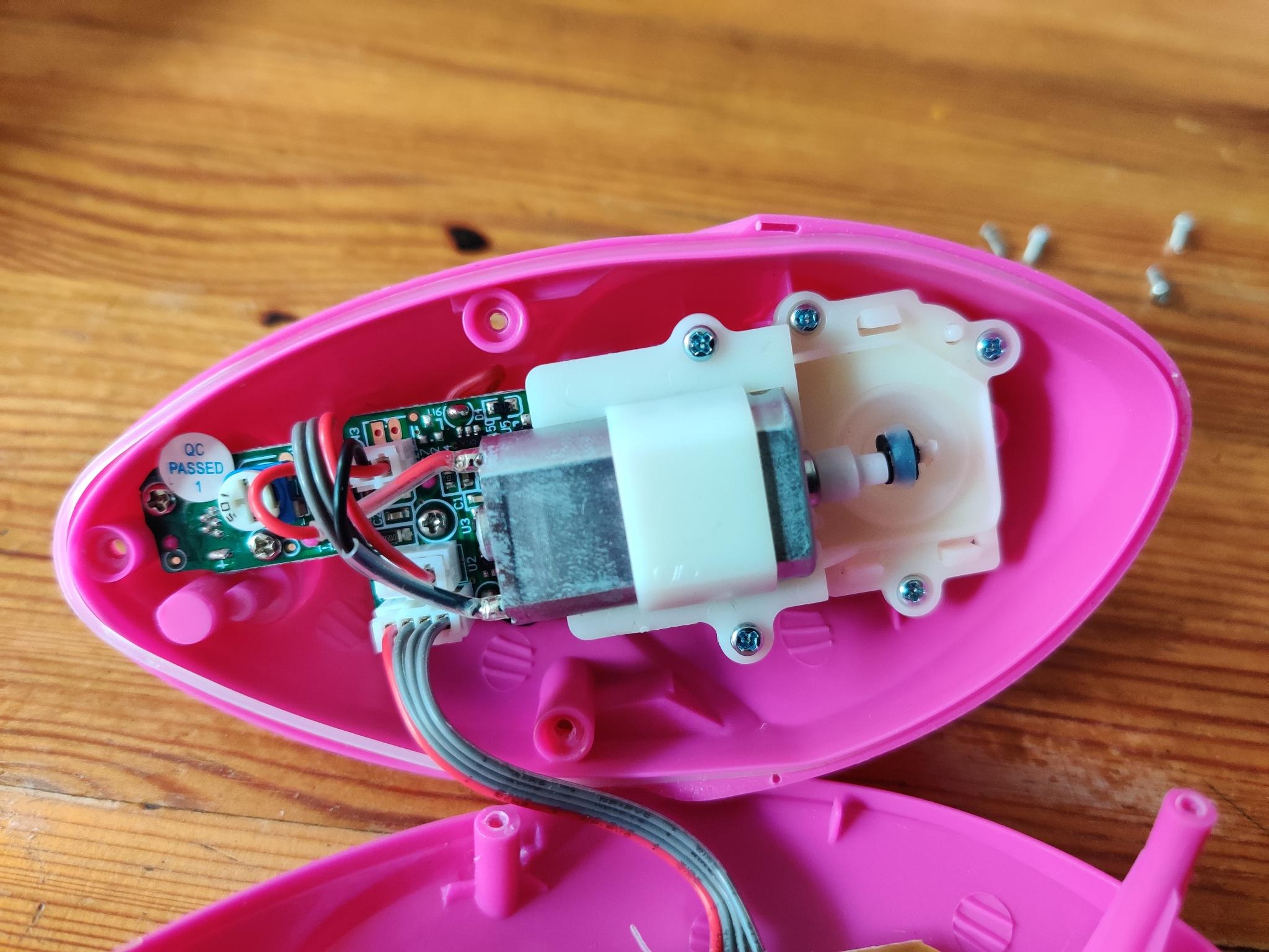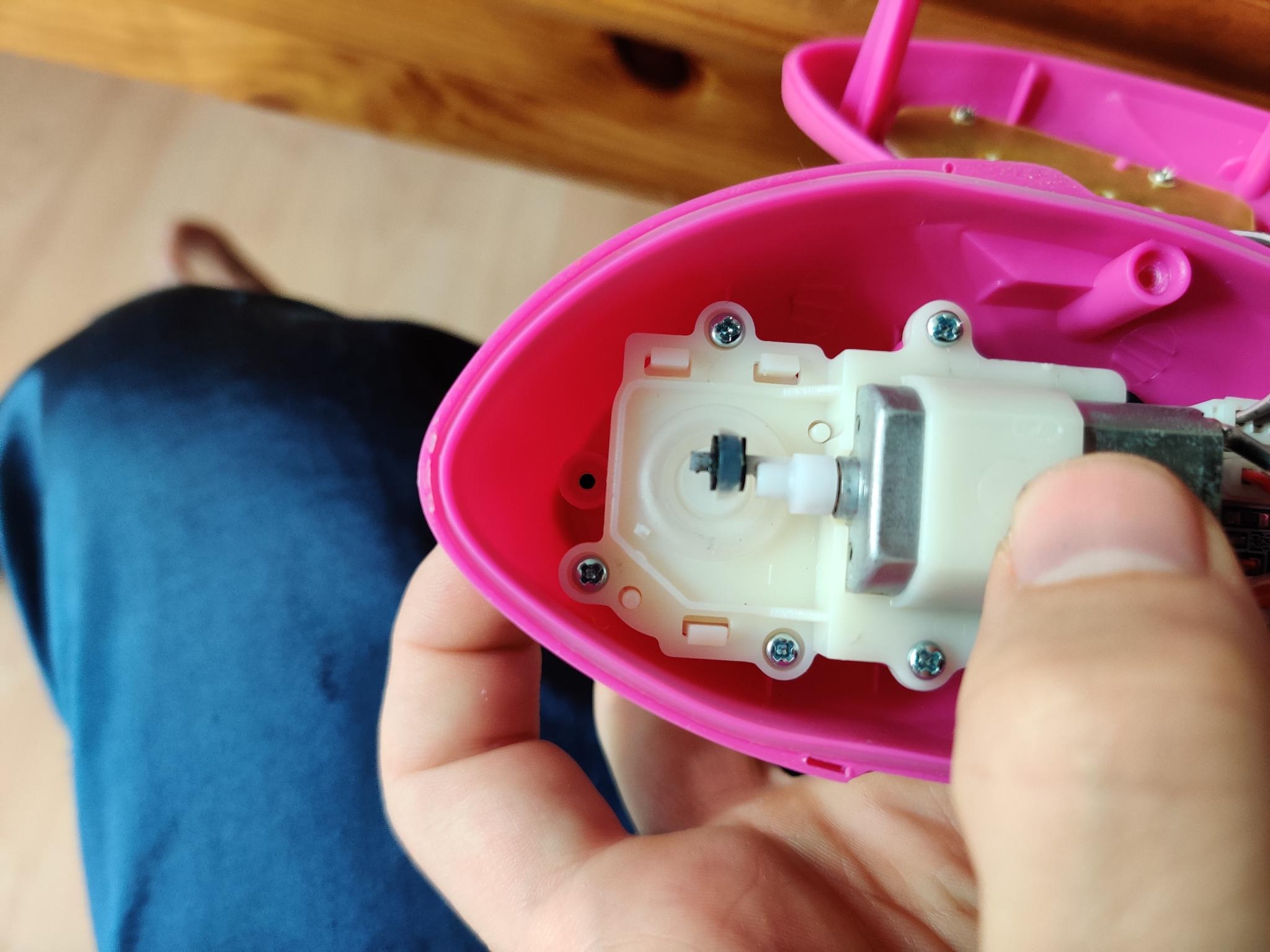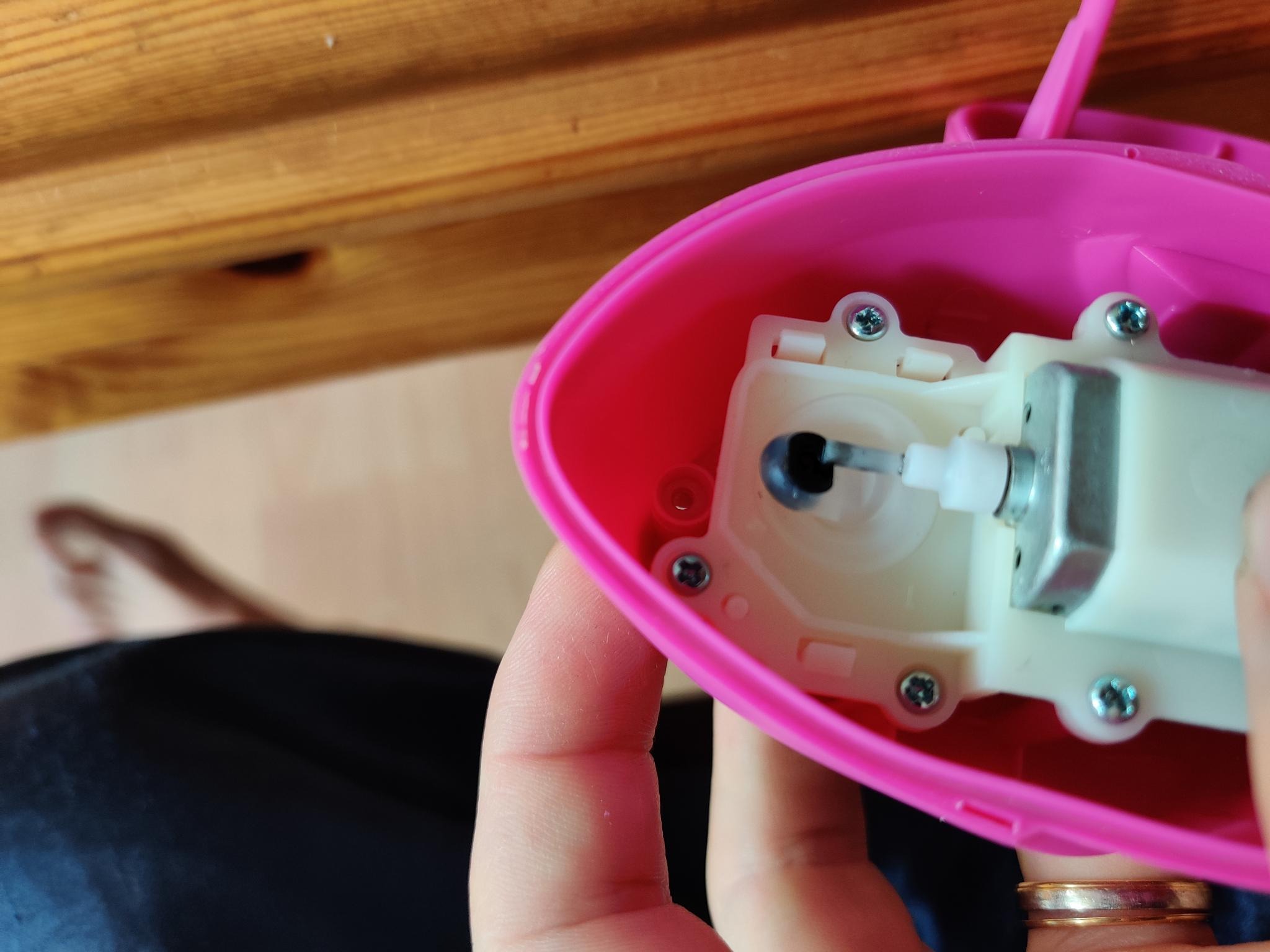 Le mécanisme est simple, boutons d’allumage, batterie, moteur. Sur le moteur il y a un axe, et ce qui s’apparente à un vilebrequin qui transforme le mouvement de rotation en mouvement de va-et-vient. Ceci relié à la membrane, pour la faire monter, descendre et créer la stimulation d’air caractéristique de cette marque. J’allume, et le problème est visible immédiatement : juste sur l’axe du moteur, ça couine. Au niveau de la petite pièce noire qui s’enfile sur l’axe. C’était donc une autre possibilité que ce à quoi j’avais pensé au départ : pas de lubrification suffisante ! C’est fréquent dans notre domaine