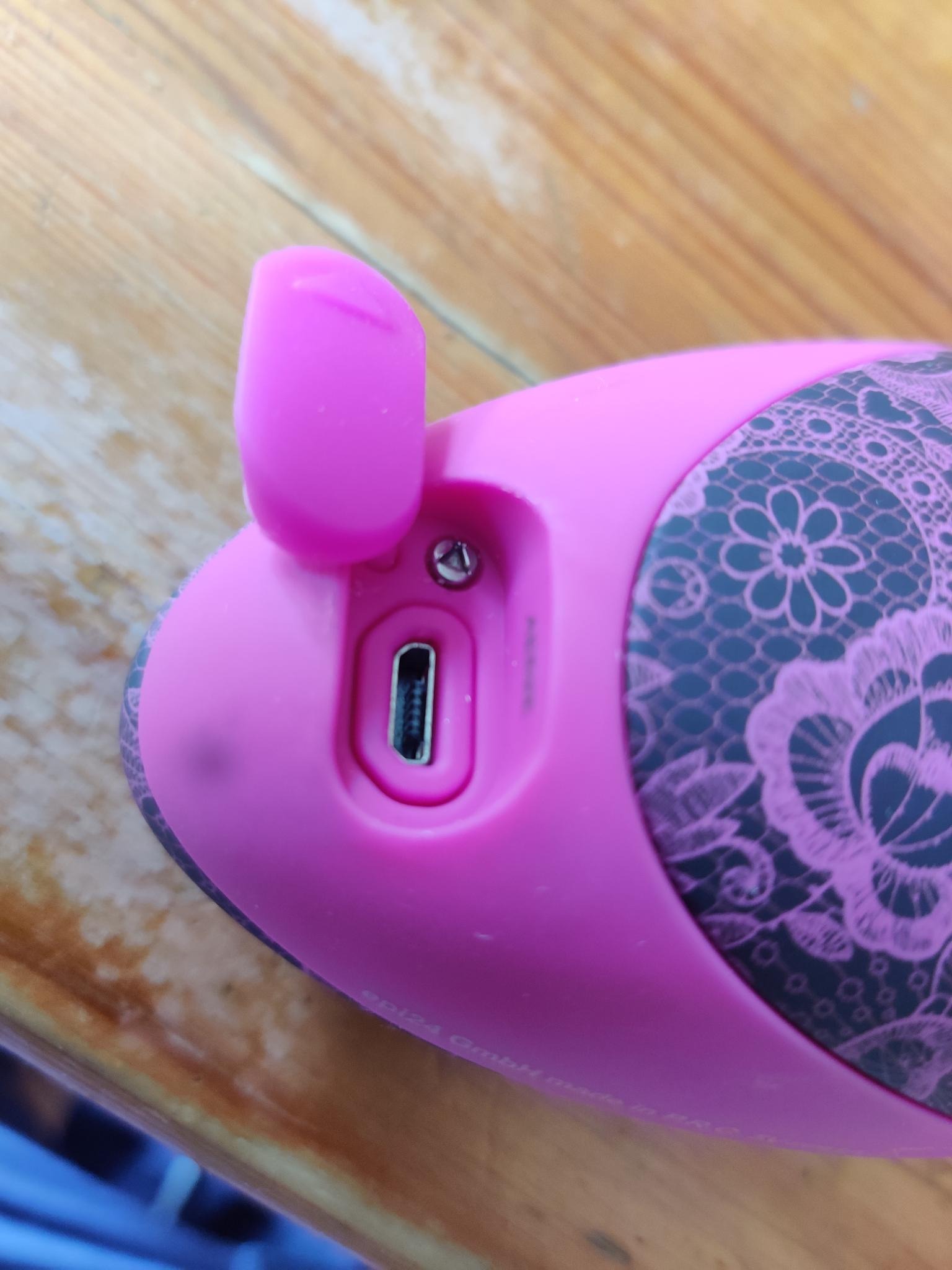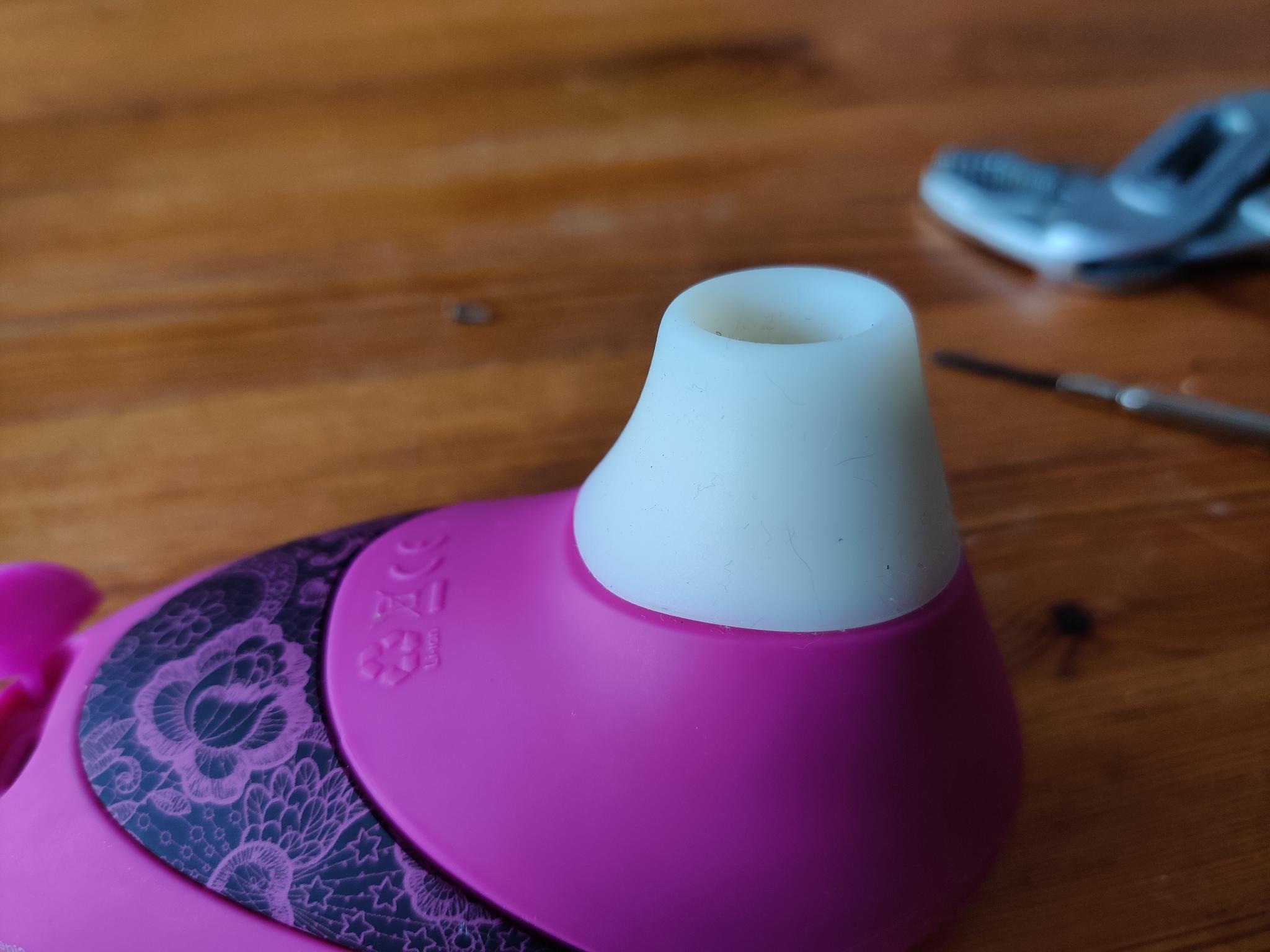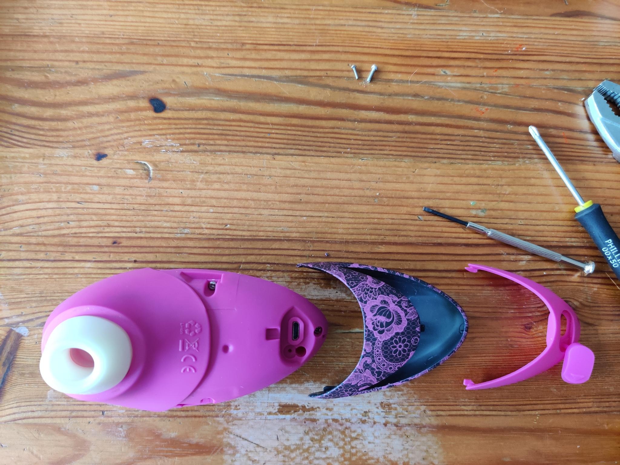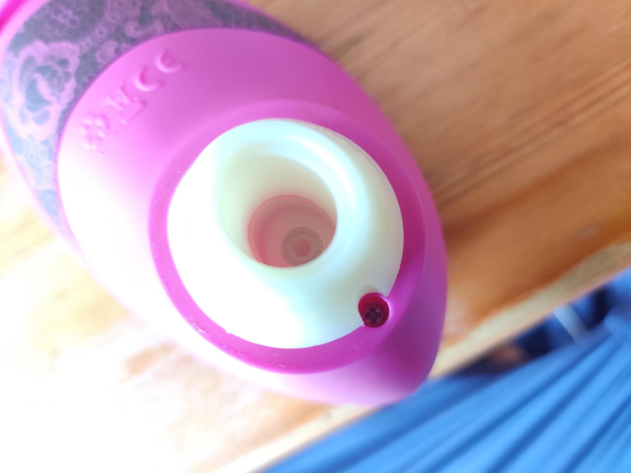 Enfin, pour ouvrir l’appareil, il reste une vis moins sympathique. Il faut enlever l’embout souple qu’on pose sur le clitoris pour la faire apparaitre. Et là : c’est une tête de vis triangulaire. Soit vous avez des embouts adaptés, soit vous en achetez, soit vous faites comme moi et vous vous débrouillez.
