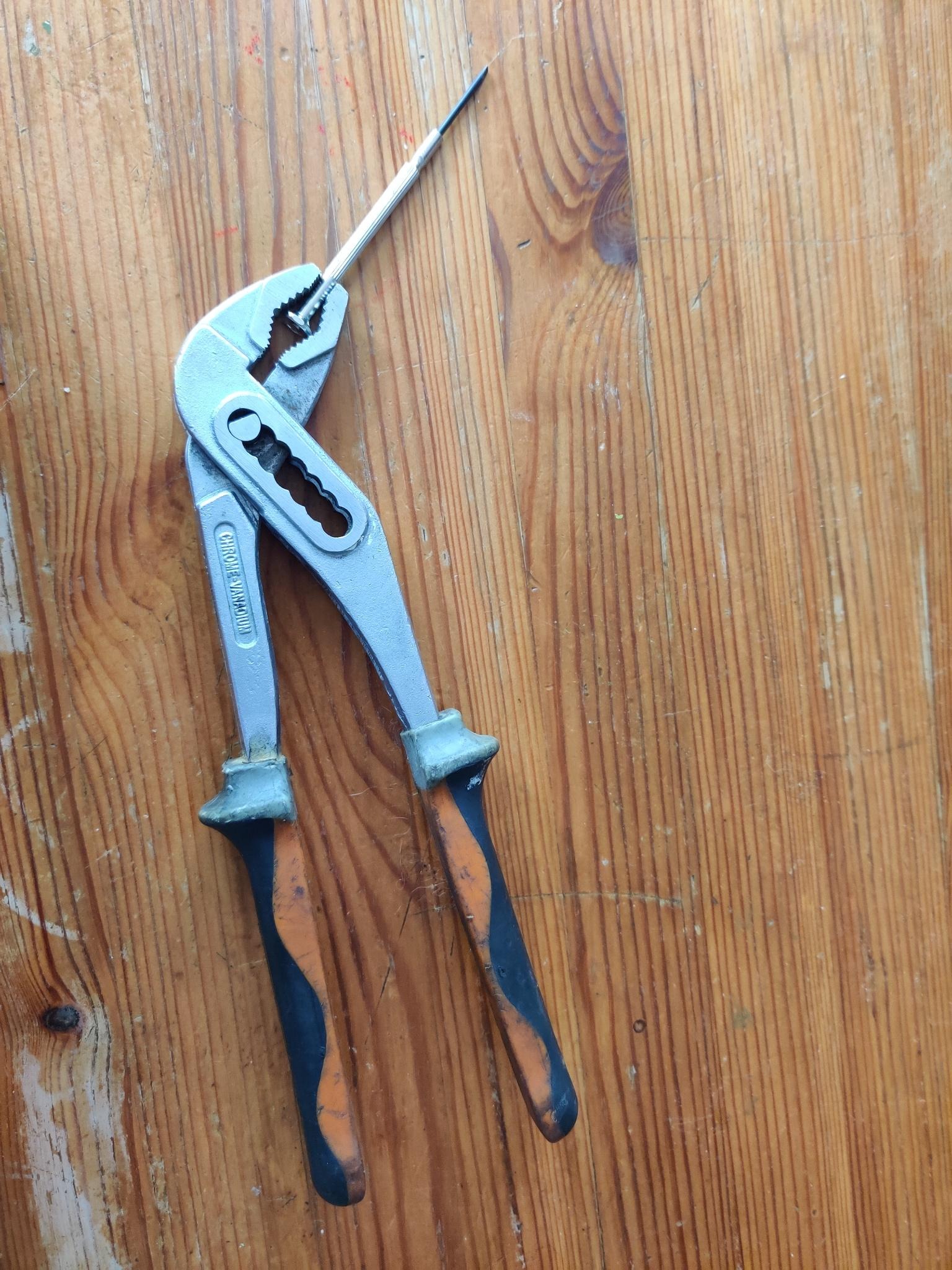 Concrètement, j’ai pris un tournevis plat, coincé sur un des côtés du triangle. Il faut alors appuyer fermement sur le tournevis avant de dévisser. Je l’ai fait avec l’aide d’une pince.